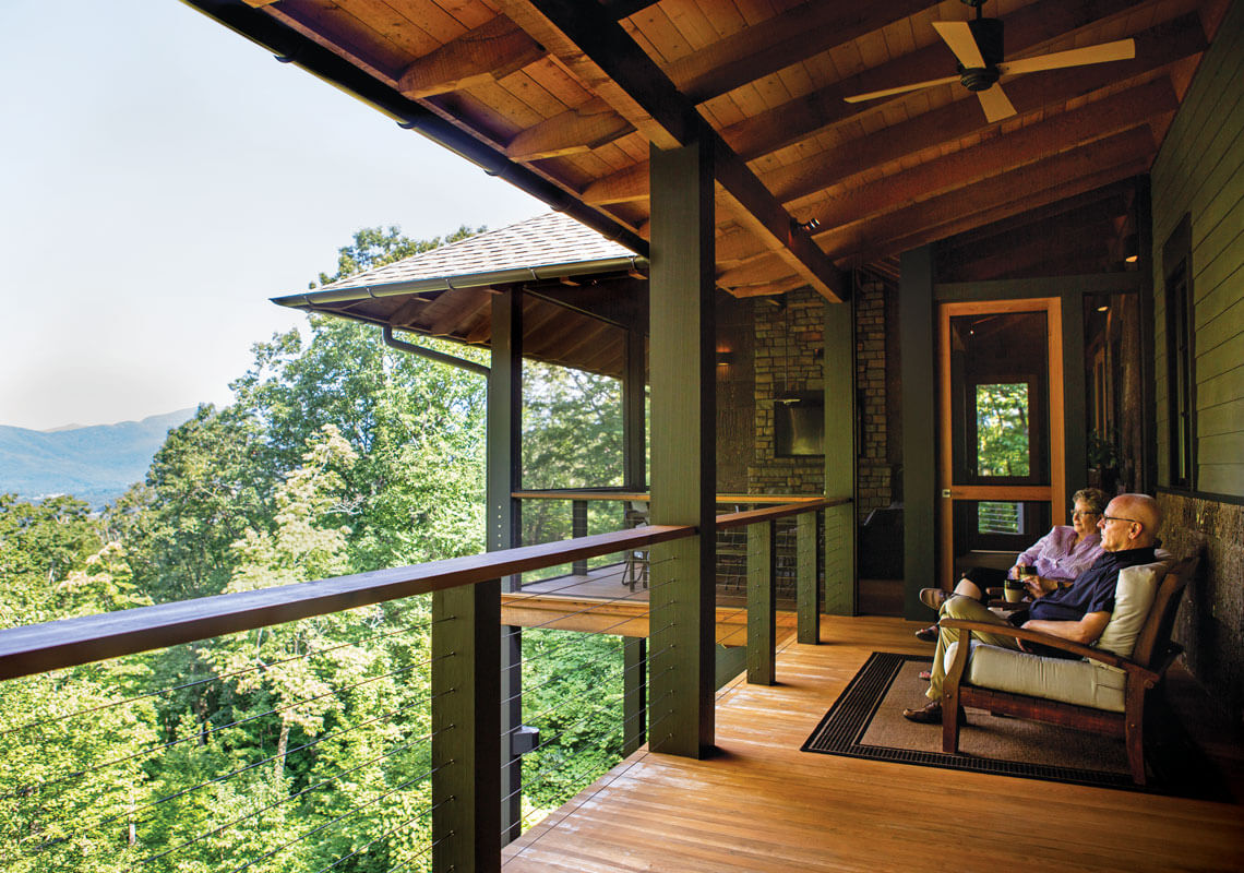 In the late afternoon, Susan and Jim Jones retire to their open back porch, facing west toward Mount Mitchell and the Blue Ridge Parkway, to watch the sun set over the Swannanoa Valley. photograph by Tim Robison