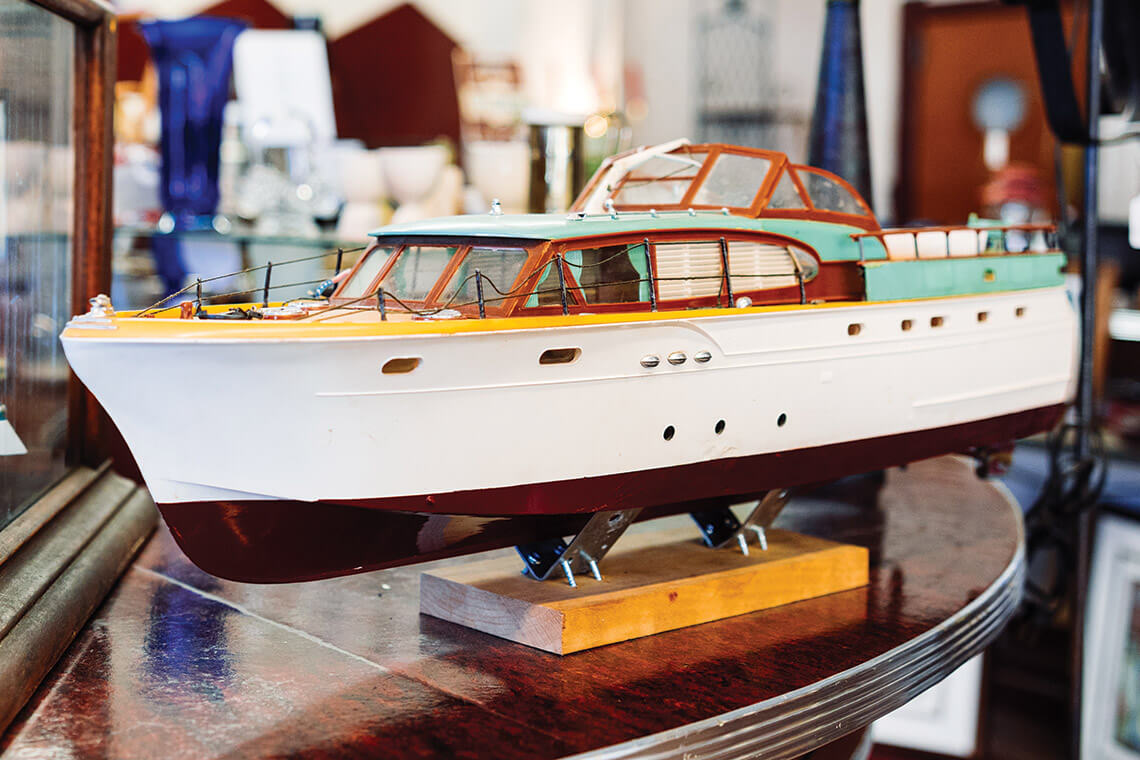 A Chris-Craft Constellation model sits next to a case of fudge at Burgaw Antiqueplace. The 18-inch vessel, which Johnny Westbrook purchased years ago, reminds him of his boating days on the Chesapeake Bay. photograph by Matt Ray Photography