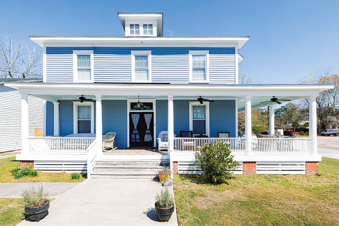 For years, Larry Owens would look out from his office across Dickerson Street at a traditional American Foursquare. The house had sat empty for 12 years. The floors on the left side of the structure were termite-ridden, but Larry saw potential. In 2021, he and his wife, Beth, purchased the property without a plan for its future use. Their first priority was “to save the house,” Larry says, “and then we had to decide what to do with it.” The couple soon discovered that the 1896 house had been operated by the Black family as the Black Hotel until the 1930s or ’40s, when it became a private residence. With that information in mind, the Owenses restored the home to its former glory. Now, as a boutique hotel, The Pender House contains five guest rooms — all named for Pender County municipalities — that are tastefully decorated by Beth, who’s an expert at finding vintage items at auctions, like a ’60s-era Sears, Roebuck and Co. couch in mint condition.