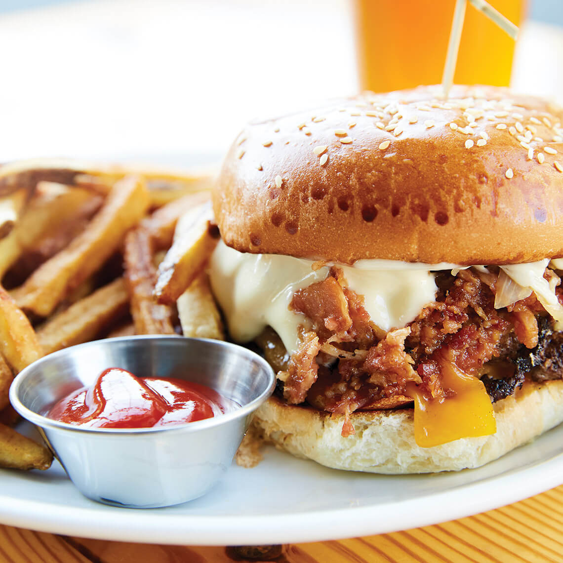 The Glencoe Smashburger is topped with bacon jam, Cheddar cheese, caramelized beer onions, and garlic aioli.<br><span class="photographer">photograph by Stacey Van Berkel</span>