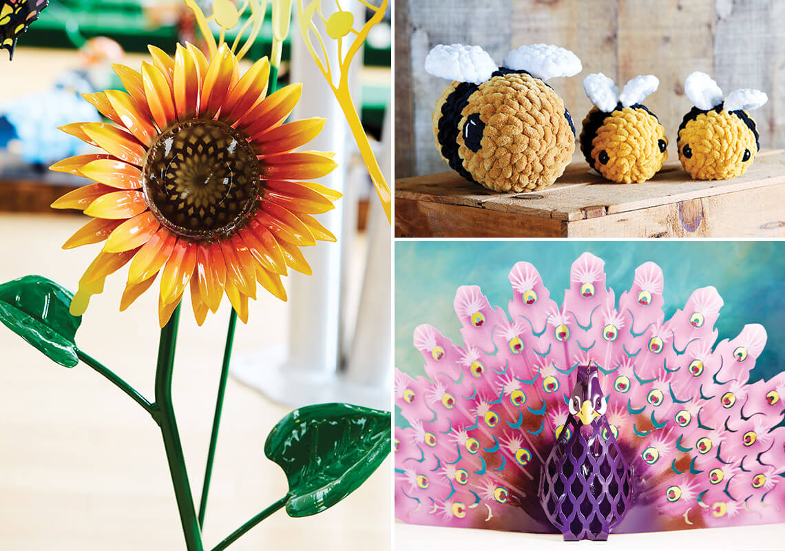 At Owl & Rabbit Gallery, you’ll find whimsical works of art like a two-foot-tall sunflower and a purple peacock made by gallery owners Emily and Casey Lewis, and crocheted bees made by their daughter, Claire. photograph by Stacey Van Berkel