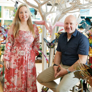 An eight-foot-tall metal flower is hard to miss. In fact, the sight of one in a yard is what motivated a landscaper to stop and talk with artist Casey Lewis, who was using his talent as a metal sculptor to give his backyard an Alice in Wonderland theme for his daughters, Ellie and Claire. That conversation became the start of Beechwood Metalworks, a custom fabrication shop that initially handled industrial projects. Now, Casey and co-owner, Emily Lewis, make large-scale ladybugs, flowers, bees, rabbits, and just about anything else an imagination can dream up. “Everything is curated to be whimsical, colorful, and nature-inspired,” Emily says. Beechwood sculptures have primarily been installed at children’s hospitals in North Carolina and across the country to bring a bit of fun and positivity to families as they face some of the hardest moments of their lives. In 2018, Emily and Casey opened Owl & Rabbit Gallery in downtown Burlington to showcase some of their Beechwood work — albeit on a small scale — and promote local makers. More than 100 artists working in a variety of media, from pottery and needle felting to paint and wood, are represented.