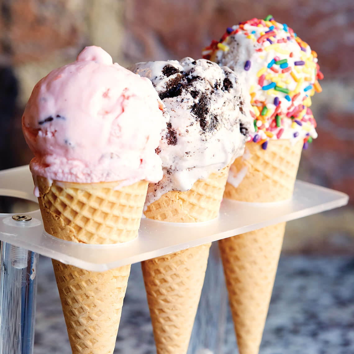 At Smitty’s Homemade Ice Cream, some favorite flavors include (from left to right) amaretto cherry chip, Oreo, and brown sugar oatmeal. photograph by Stacey Van Berkel