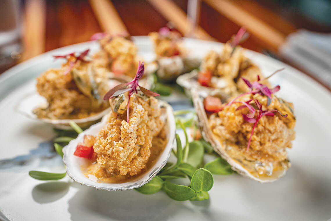 Named for Chef Ashleigh Fleming’s grandmother, the Oysters Clara are a Blue Jay Bistro favorite, featuring crispy-fried Gulf oysters, collard green béchamel, bacon, and hot sauce. photograph by Charles Harris
