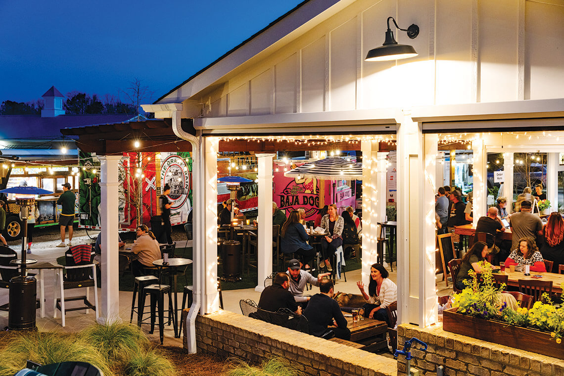 For many years, people gathered to cook barbecue outside the Exxon gas station that sat at the corner of Southwest Broad Street and Morganton Road. The station was commonly known as Red’s Exxon, named for the redheaded man who owned it. Four years ago, Rachel Jurgens purchased the two-acre lot that Red’s once sat on to secure the future of her 14-year-old drive-through coffee business, Pony Espresso, which occupied the same lot. Jurgens envisioned the space as a colorful food truck park, where families could sample different cuisines. After opening last March, Red’s Corner became the gathering place that Jurgens had hoped for: Kids now enjoy the on-site playground while adults chat over cold beers from the bar. And in December, when Moore County lost power for several days, Red’s trucks were still up and running on generators. “I was really blessed to be open,” Jurgens says. “We fed all of Moore County.”