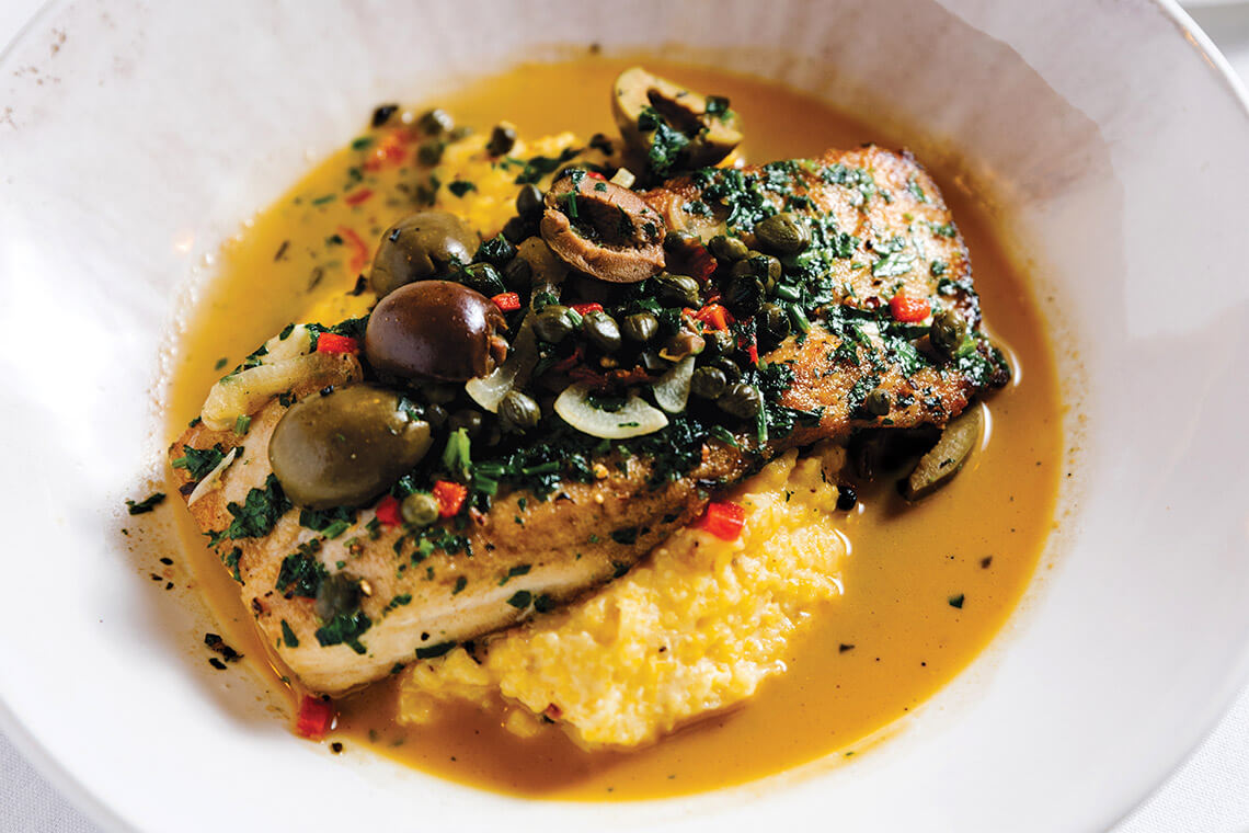 Try roasted grouper with capers, olives, and tomatoes served over grits at Chef Warren’s Bistro. photograph by Anna Routh Barzin