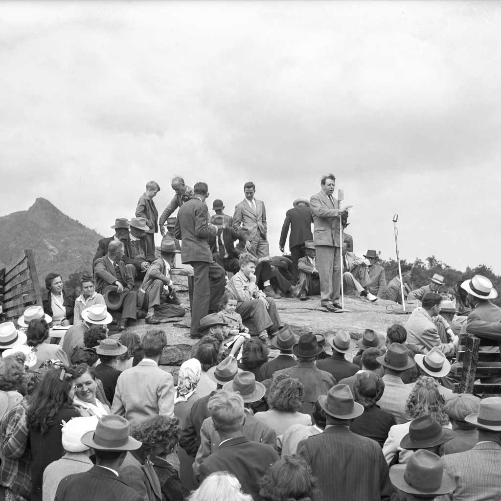 In June 1947, Governor Broughton addressed the crowd at the Singing on the Mountain gospel festival on Grandfather Mountain. At the time, Broughton was beginning his senatorial campaign. photograph by Hugh Morton Photographs and Films, North Carolina Collection, UNC Chapel Hill Library
