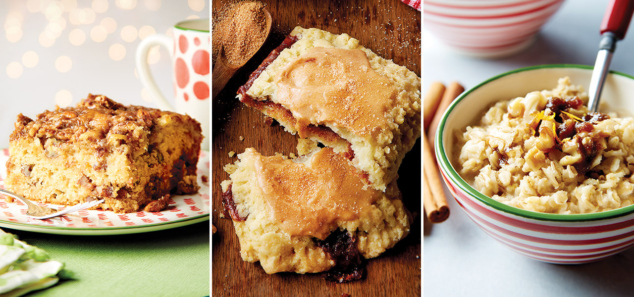 For the coffee cake: Preheat oven to 350°. Prepare an 8-inch square pan with nonstick cooking spray. In a large bowl, stir together flour, baking powder, baking soda, salt, brown sugar, and pecans. In a small bowl, stir together the maple syrup, vegetable oil, milk, eggs, and extracts. Stir the sour cream into the wet ingredients until combined.