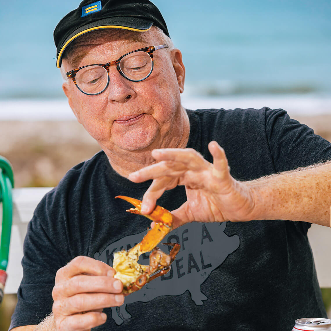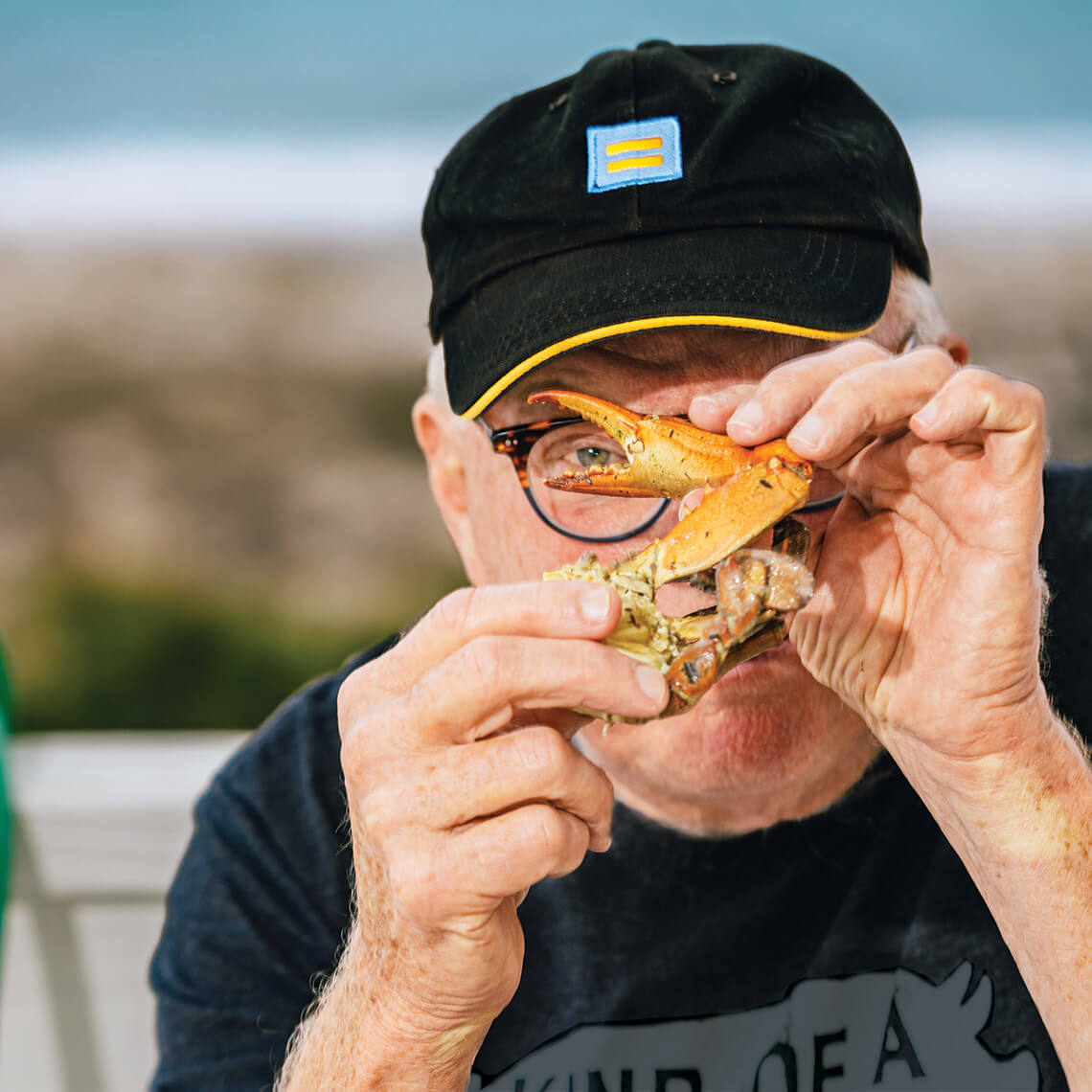 Shell a crab with Chef Smith: 1) Pinch claw between forefinger and thumb.<br><span class="photographer">photograph by Baxter Miller</span>