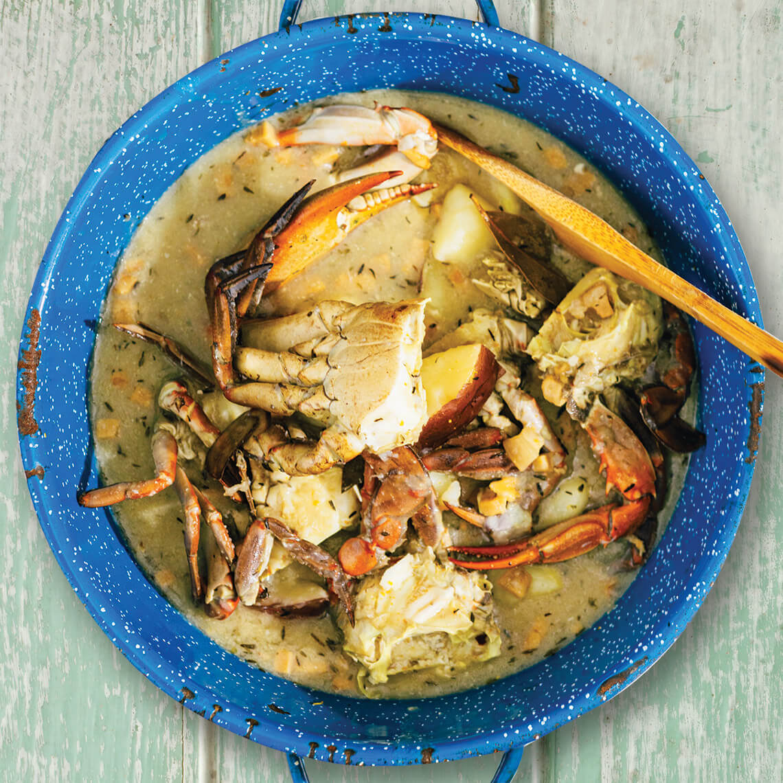 I always thought that crab stew was too messy to serve in a restaurant. From time to time at Crook’s Corner, I would attempt a cleaned-up version, but it just wasn’t the same. It is a stew, but one that’s eaten mostly with the hands. As you eat, you put the shells all over the table. You really need to be outdoors, with lots of napkins, at newspaper-covered picnic tables. That way, when you’re finished, you just roll all of the shells into the paper and take it straight to the trash.