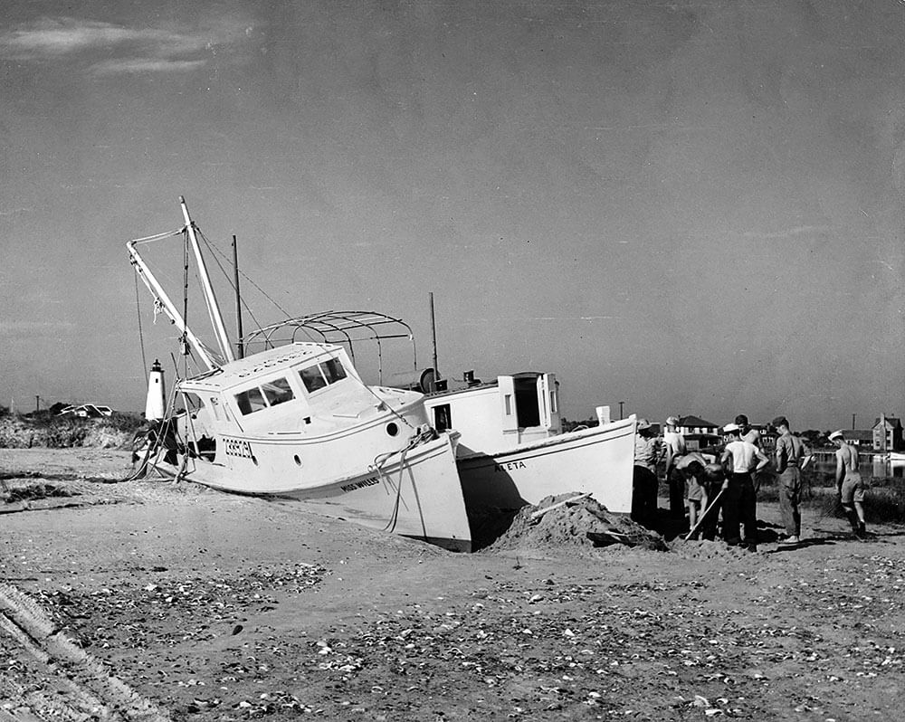 The storm moves up the coast, striking Hatteras Island. Fishing boats are slammed onto the shoals, damaged or sunk.