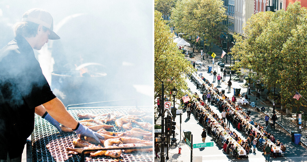 Dozens of dinner tables stretch down Fayetteville Street, anchored by the State Capitol at one end and Memorial Auditorium at the other. Hundreds of volunteers prep drink stations, set out more than 1,000 chairs, and decorate the tables with seashells and sand dollars. Chefs and pitmasters are finishing their dishes, including gallons of Brunswick stew, 90 racks of glazed pork ribs, and 1,000 smoked chicken quarters. Checking in on all of them is Raleigh chef Scott Crawford, who helped bring these folks together on this Sunday afternoon. Crawford often cooks for charity dinners, but today, the logistics are mind-boggling: He’s serving up North Carolina’s signature dishes at a sit-down dinner that spans two city blocks.