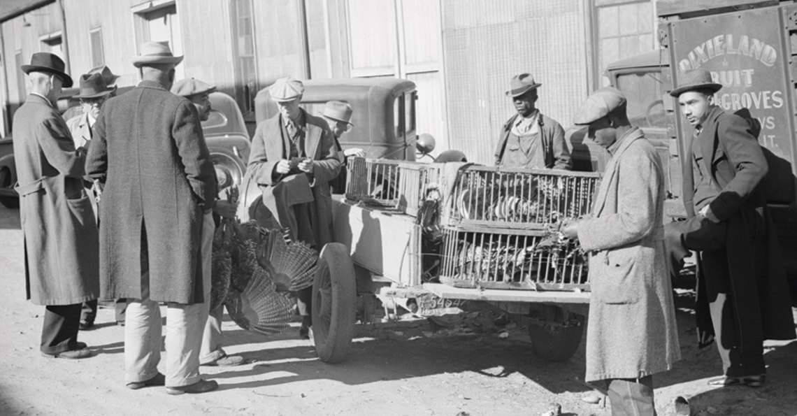 During the first half of the 20th century, farmers from across the region flocked to Durham’s warehouse district for the fall tobacco auction season. Local stores often held big sales to capitalize on the influx of farmers, who now had cash to spend and time to spare. Outside the auction warehouses, they could buy products like socks, shoes, scarves, ties, tablecloths, medicines, produce, and livestock — including, around Thanksgiving, live turkeys.