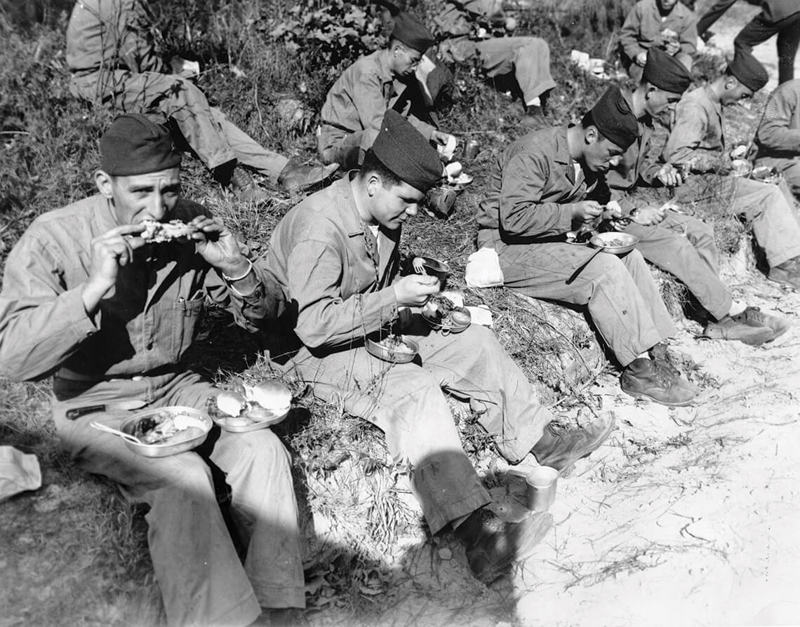 These Marines from Camp Lejeune’s Motor Transport School in Jacksonville may not have been able to celebrate the holidays with their families, but they were still treated to a full Thanksgiving dinner. While in the field for truck driving and combat training, they took a break to enjoy “the bird of the season and accessories on the roadside.” The base had just been established two years earlier in response to the United States’ need for an amphibious training facility on the East Coast during World War II.