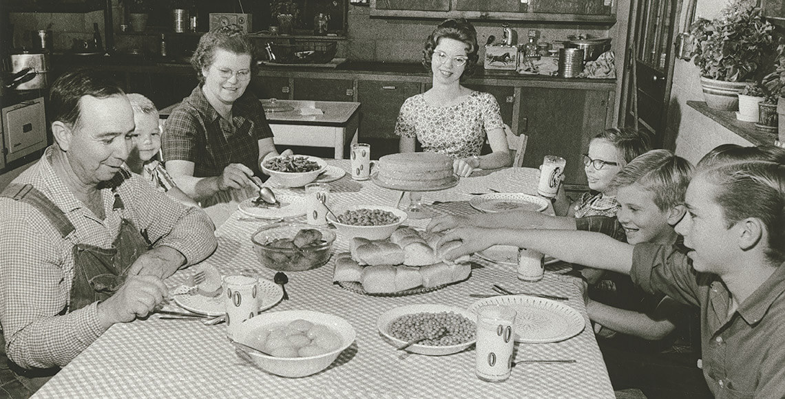 In the mid-’60s, a family of 11 — like that of Forsyth County residents Clay and Bernice Smith, pictured here with five of their nine children, (from left) Gary, Gloria Jean, Karen, Denny, and Norris — would have paid about $11.65 for their entire Thanksgiving meal, compared to an average of $77.52 today.