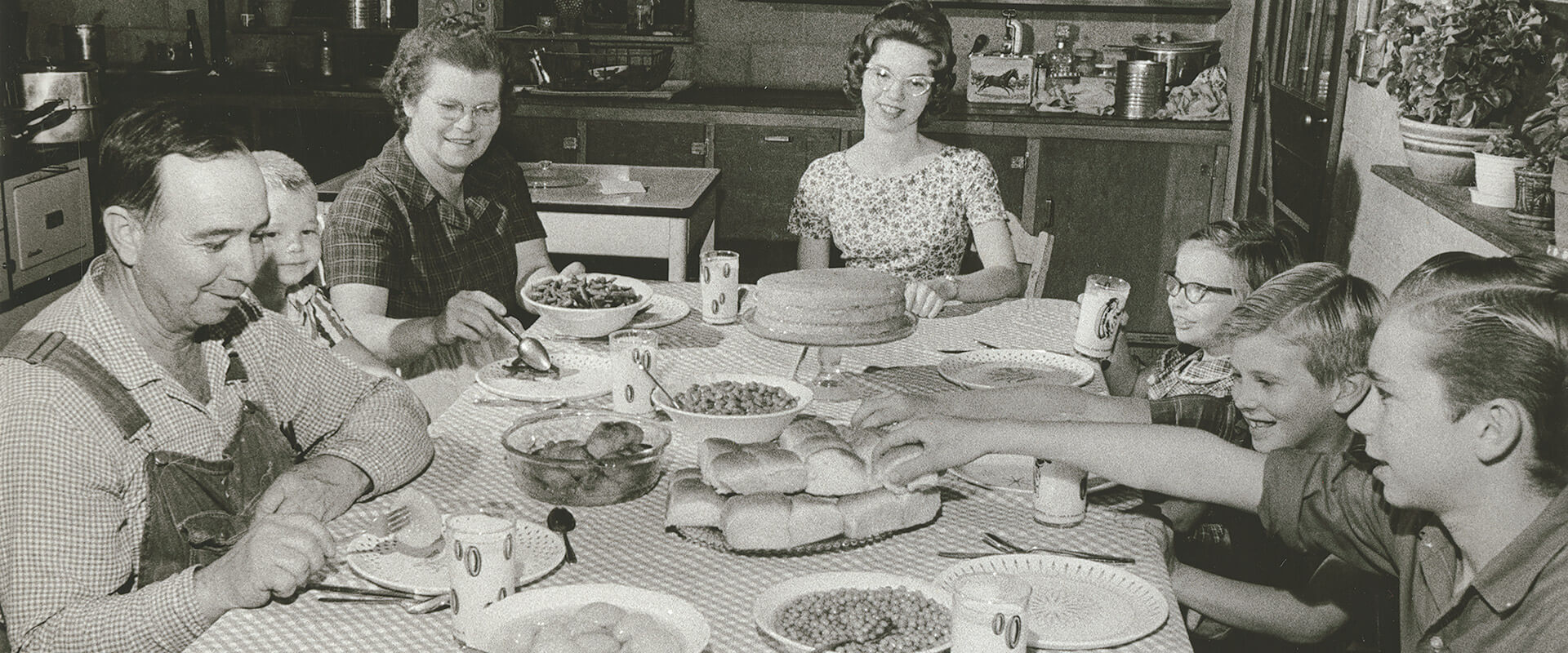 In the mid-’60s, a family of 11 — like that of Forsyth County residents Clay and Bernice Smith, pictured here with five of their nine children, (from left) Gary, Gloria Jean, Karen, Denny, and Norris — would have paid about $11.65 for their entire Thanksgiving meal, compared to an average of $77.52 today.