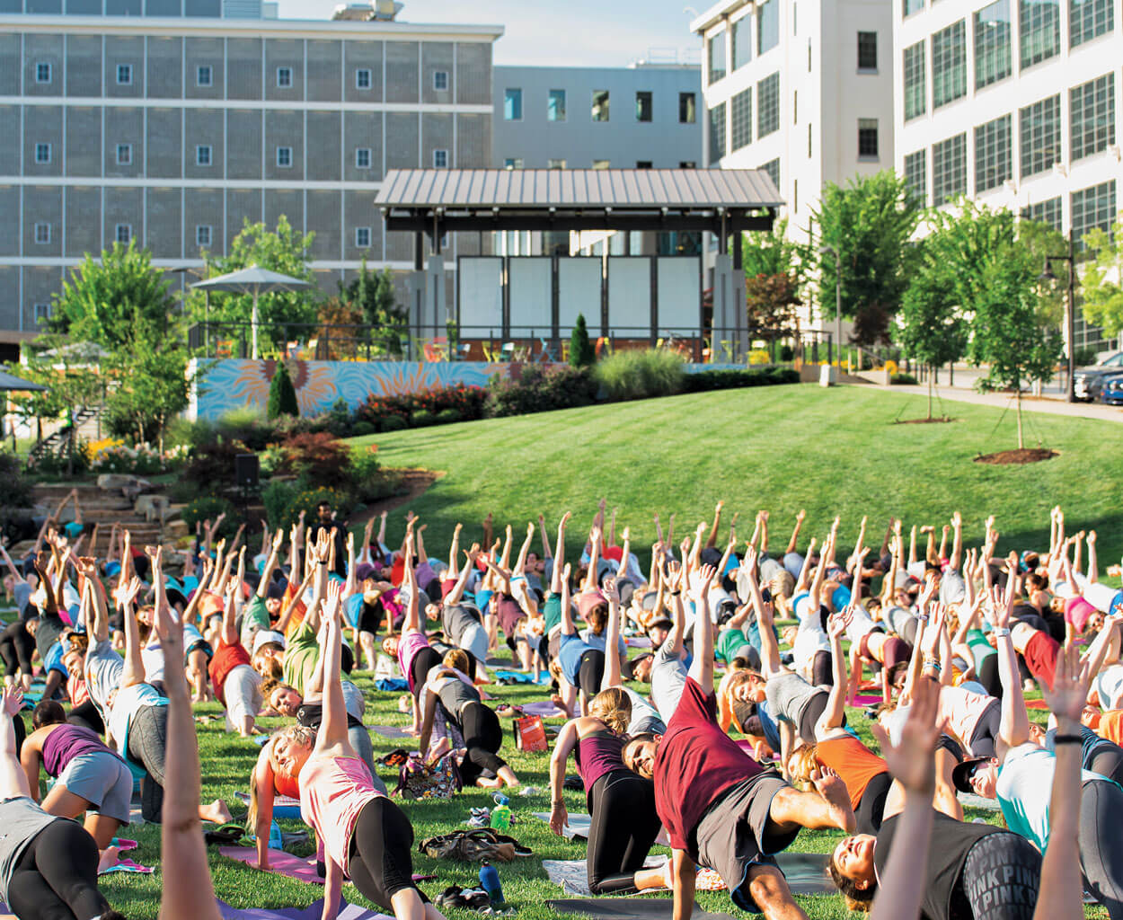 Just as the sun dips behind Winston-Salem’s skinny R.J. Reynolds smokestack, a blanket of shade revives the 100 or so yogis moving into warrior pose on the grassy lawn of Bailey Park. Their Sunset Salutations class — a free yoga practice held every third Wednesday of each month — has been going strong for 10 minutes, but latecomers are still arriving on the scene and rolling out their mats.