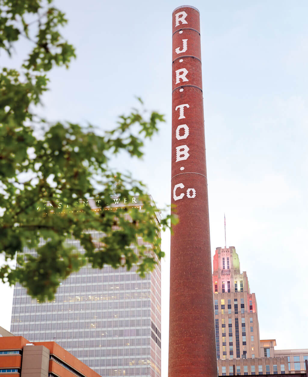 The iconic, 130-foot-tall R.J. Reynolds smokestack — built in 1949 — watches over what is now Innovation Quarter. photograph by Stacey Van Berkel