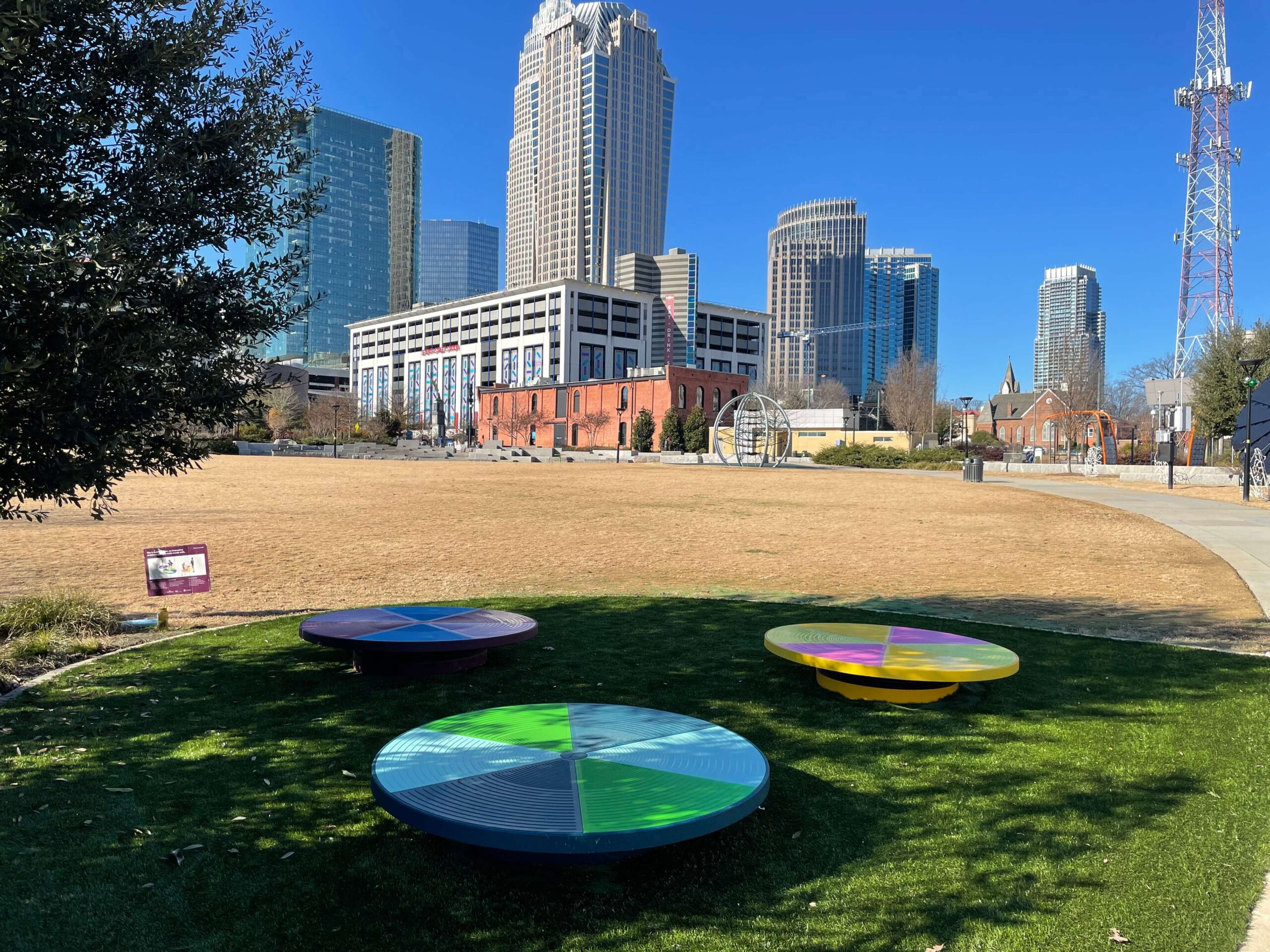 A friendly cacophony of musical notes and laughter floats over the grass in Charlotte’s First Ward Park as a father and his two sons discover how to plant their feet just right on Balancing Act. This interactive public art offers three brightly colored wobbly discs that dare park-goers to find their balance and make their own song. Those who attempt are rewarded with musical notes that play from different sections on the discs — and a core workout.