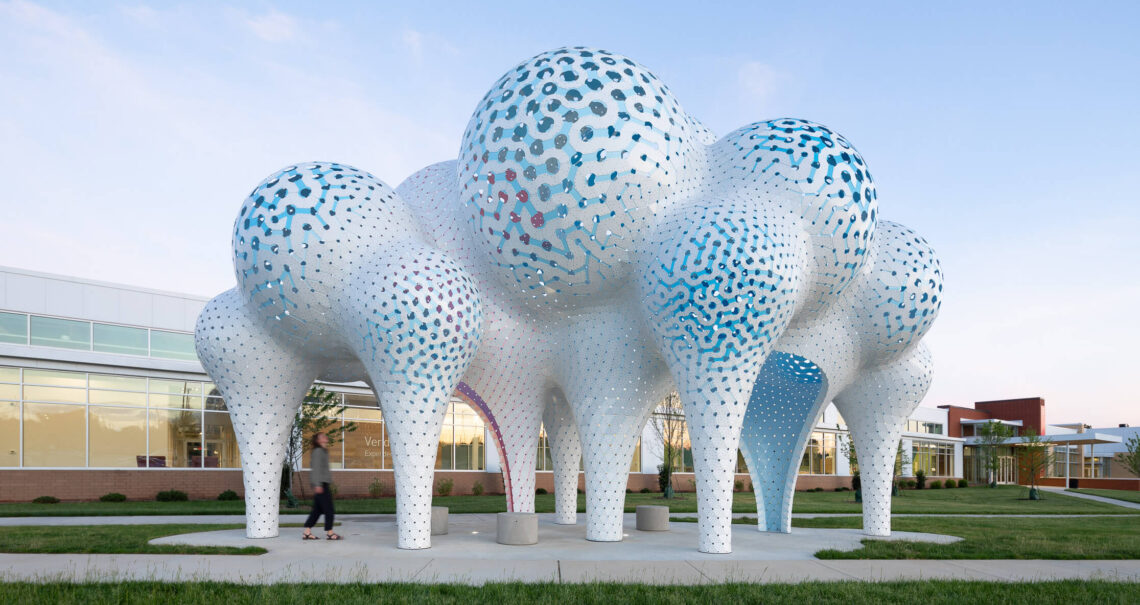 The artist Marc Fornes, a forerunner in computational design, intentionally created Pillars of Dreams Plaza as a restful place for reunion and reflection. “It’s really meant to be experienced,” Hanzal says. “As you go beneath the canopy and look up through the perforations, you see the sky above and it changes into a beautiful violet color because of how the sculpture plays with light and shadow.”