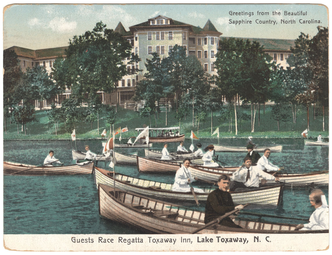 In its first incarnation, before the dam broke and the lakebed dried up, Lake Toxaway was a playground for guests of the Toxaway Inn, shown boating in a regatta in this 1907 postcard. photograph by The Durwood Barbour Collection of North Carolina