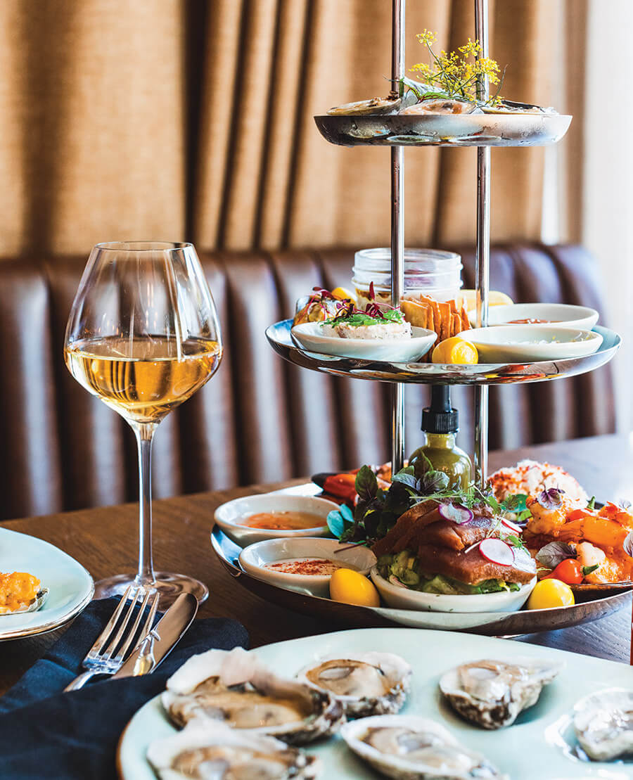 At Seabird, raw oysters are served with a seafood tower that includes pickled shrimp, smoked tuna with harissa aioli, raw clams, trout roe and egg salad, pickled quail eggs, anchovies, crab salad, marinated tuna, escabeche (marinated fish), crackers, and cocktail and seaweed mignonette sauces. photograph by MALLORY CASH