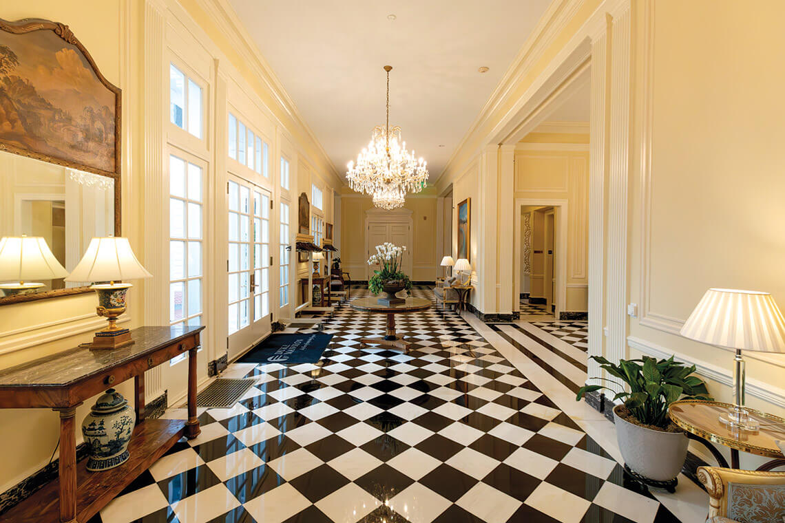 Installed by James B. Duke in 1919, the black- and-white marble floors are a signature feature of Duke Mansion’s Grand Foyer. photograph by Lauren Martinez Olinger