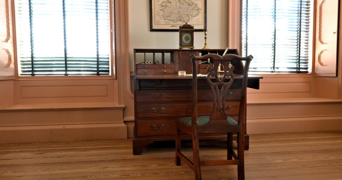 Keep your eyes open for Caswell’s original, gate-leg table in the Council Chamber among the Palace furnishings, and imagine the many lives across the history of this nation that table has witnessed. In the upstairs bedroom, you’ll also find Martin’s desk.