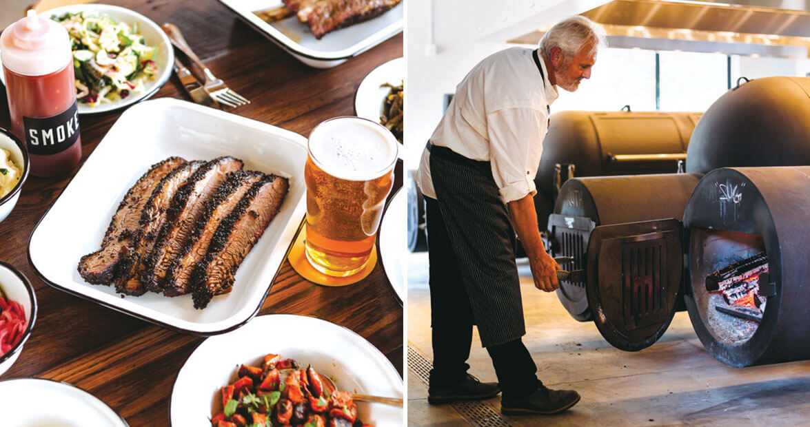 It’s nearly dinnertime, and Aunt Sug, Uncle Boy, Wade, Gilbert, Stamie, and Ruth are hard at work in the 1,800-square-foot smokehouse of the newest barbecue joint in Charlotte, Noble Smoke. The group of six is fired up — and rightly so. They’re the custom-built, Texas-style steel smokers tasked with infusing savory flavors into the pork, brisket, and turkey at Chef Jim Noble’s new restaurant, 25 years in the making. The smokers are named after Noble’s family members primarily for logistical reasons: so the kitchen staff knows which meat is in which smoker. But the naming scheme also pays tribute — as does the entire restaurant — to the history of Southern barbecue, from home cooks to professional pitmasters.