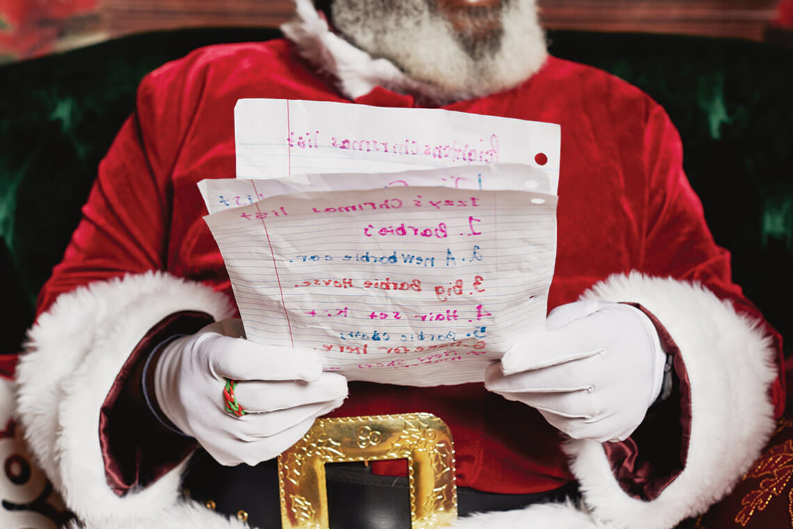 The children’s Christmas lists may not be typed and double-spaced, but Santa Joe still dutifully reads every creatively spelled word on them. photograph by Alex Boerner