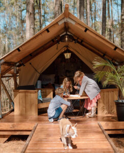 For an outdoor experience that doesn’t forgo an indoor private bathroom, cooking facilities, and other creature comforts of home, try a glamping tent at Sugarneck. Photography courtesy of Visit Sanford