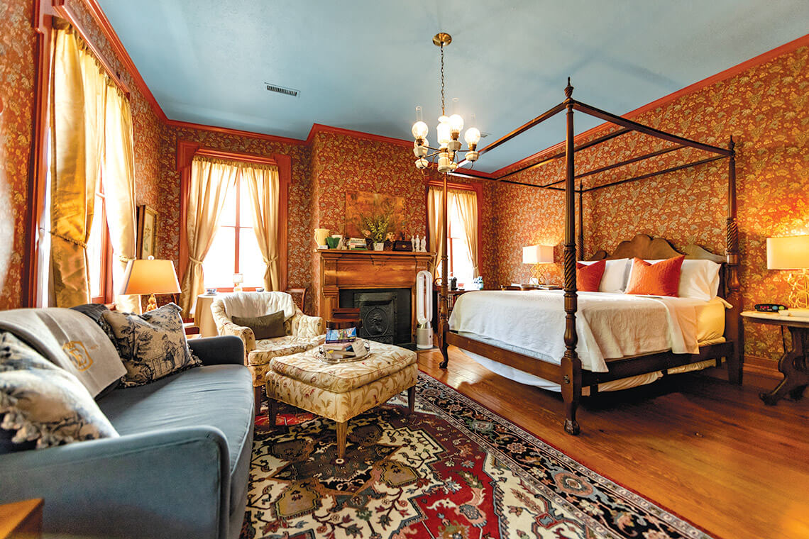 The dining room, with its commanding chandelier and 100-year-old hand-blocked wallpaper, is where the second “B” in B&B can be found. “Breakfast is the best meal, and I take it very seriously,” Richard says. Today’s features lemony-yellow scrambled eggs beside a French toast casserole — both airy as a soufflé — smothered in homemade strawberry compote, and served with petite biscuits that are square rather than round since Richard sometimes uses the same cutter to make shortbread for occasional afternoon teas. Don’t feel like getting out of that fluffy bathrobe? Have breakfast or coffee and tea delivered to your room, or opt to dine on the magnificent front porch overlooking a pair of fountains that provide a steady, soothing backdrop.