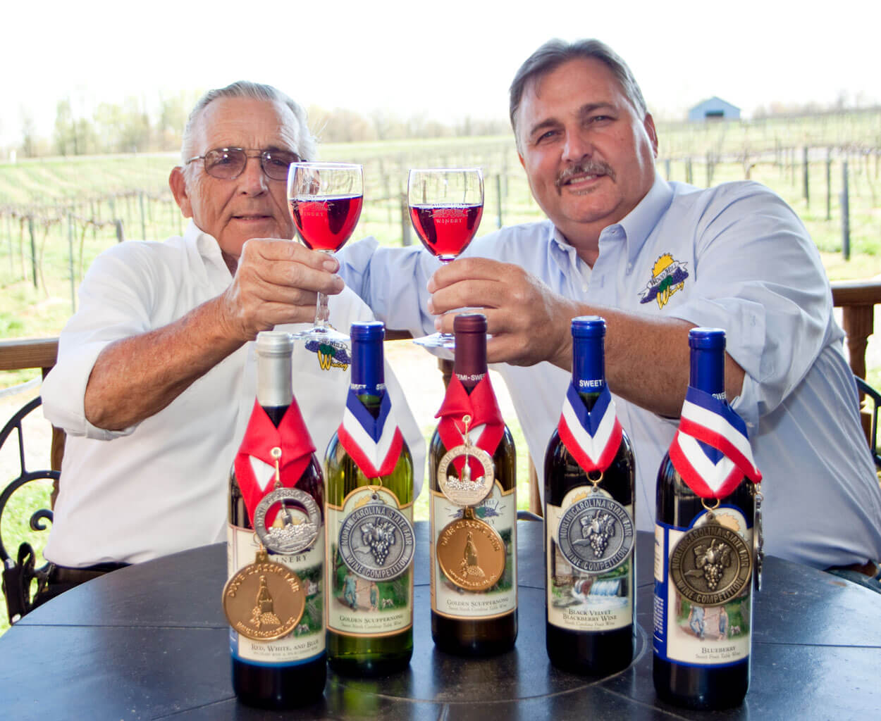 Owner Larry Cagle (right) raises a glass of Woodmill Winery’s award-winning wine with his father. photograph by WoodMill Winery