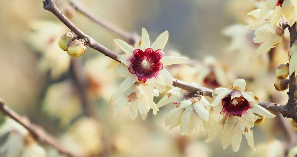 You may notice wintersweet’s lovely spicy scent before you see the shrub itself. Look closely and you’ll see the little cups of the flowers growing right along the branches of the plant. Grow it in a sunny spot with well-drained soil.