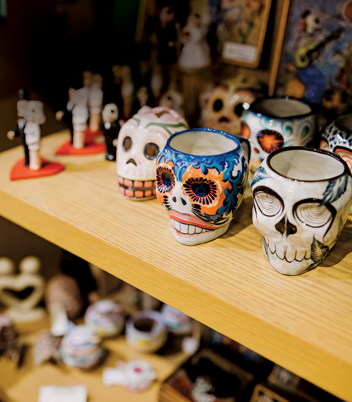 Pura Vida’s skull coffee mugs represent Mexican sugar skulls, a staple of el Dia de los Muertos. photograph by Joshua Vasko