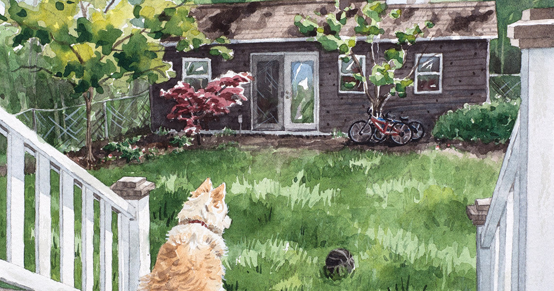 We spent an unfortunate, embarrassing amount of money resodding back there the next year. I like grass, even with all our shade, and so I’m forever adjusting with lime and fertilizer and pounds and pounds of shade seed. The problem trees, the shade trees, grow larger every year. So do the boys, who are back there this afternoon, one a pitcher and one a catcher, and they’re trying not to bean New Dog, she who is now the rightful owner of that space. She sits on the steps of the deck every day, paws crossed, waiting patiently for tasty woodland creatures to venture out, or for a delivery truck to rumble by. She lives a significant — by request, a paw on the glass of the kitchen storm door — portion of her waking life in the backyard.