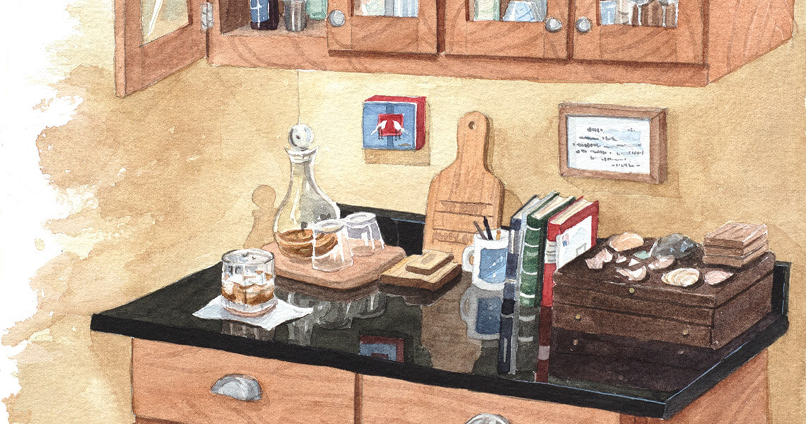 It’s a shrine, is what it is. Shells and stones from trips we’ve taken sit on an old wooden silverware case that we use for bills and change and keys and watch batteries. If it’s important, it goes in the bar. If it’s missing, it’s probably in the bar. Just last week, while looking for the title to the van, I found a stuffed rabbit that the kids’ preschool teacher made for one of them. Our bar is where we deposit our necessary things, where we keep them, the items to which meaning has attached so irretrievably. It’s a kind of catalog of what we’ve done, where we’ve been. It’s a place — every house has one — where we can go to remind ourselves, piece by piece, of who we are.