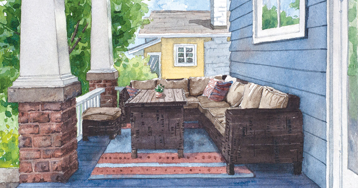 A porch, the porch, our porch — a place for coffee. For a book. For a blanket and a glass of wine. For when people come over. A back deck is for privacy, for hiding out. A front porch says hello, says may I meet your dog, says why don’t y’all come over next weekend. We can see baseball-stadium fireworks from here. I’ll step out there in the afternoons to watch a storm roll in. It’s safe. It’s cozy, if an outdoor space can be. It’s been, since I became whatever sort of grown-up I might be, a good first place to land.