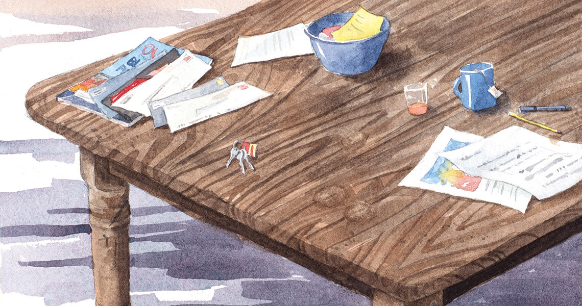 It’s where I land when I come home. I put down my keys and wallet and get a glass of something and sit down, check email, check the grocery list that also lives in the bowl, think about our next meal. The mail’s there on the corner. So’s a permission slip, a plate from breakfast, and a parachute that my older one’s making out of a trash bag and some Tupperware. We open maps here, plan trips here. I’ve sewed injured stuffed animals here. If we’re lucky, we’ll open college admission letters at this table. For now, though, tonight, after everybody’s day slows down enough, just dinner, one more time — we’ll simply gather around this ungainly, banged-up, excellent table, and we’ll each give our own kind of thanks.