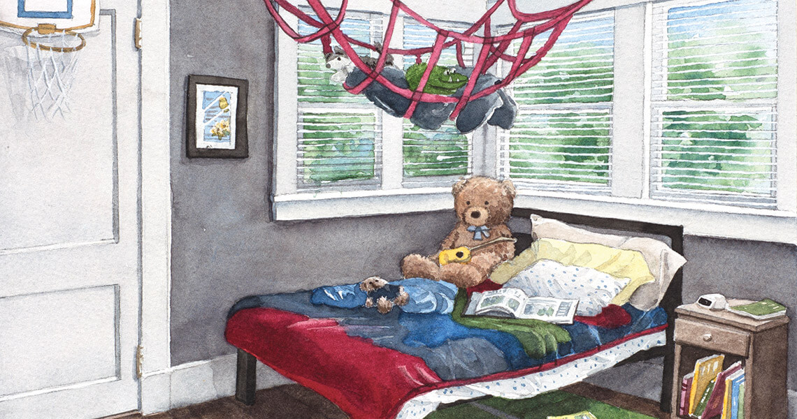 Both boys have 500-pound-rated, hot pink cargo nets bolted into their ceilings, hammock-swings that have been reading nooks, jungle gyms, stuffed animal holders. The teenager — no. Wait. He cannot be. He’s still an infant, still in the rocker that we painted sky blue. He’s still in the crib; he’s in the toddler bed; he’s 7 years old and on the bottom bunk, falling asleep while we read to him. The teenager still has that bunk bed, the one that he and I put together from a kit of 4,000 inscrutable pieces. The teenager has a wall full of books. The teenager has a piano keyboard, can play quite well. The teenager has a desk he never uses. The keyboard’s on the desk.