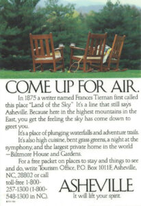 Then, in 1984, I saw a small print ad that changed everything. It had been created for the newly formed Buncombe County Tourism Development Authority by Price/McNabb, which was based in Asheville, where I lived.