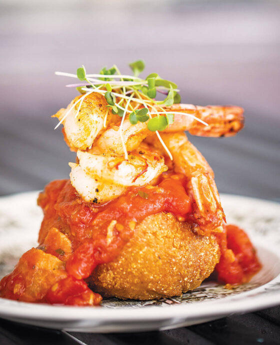 Crepes and flatbreads have joined the tapas offerings, including a green onion Parmesan crepe filled with Fontina, spinach, bacon, and mushrooms, and an apple, bacon, and Fontina flatbread. Pork chops and burgers are available, too, but the restaurant’s best seller is shrimp and grits. Not that shrimp and grits, but a fried, cheesy grits patty the size of a crab cake, topped with grilled shrimp and a tomato-bacon sauce.