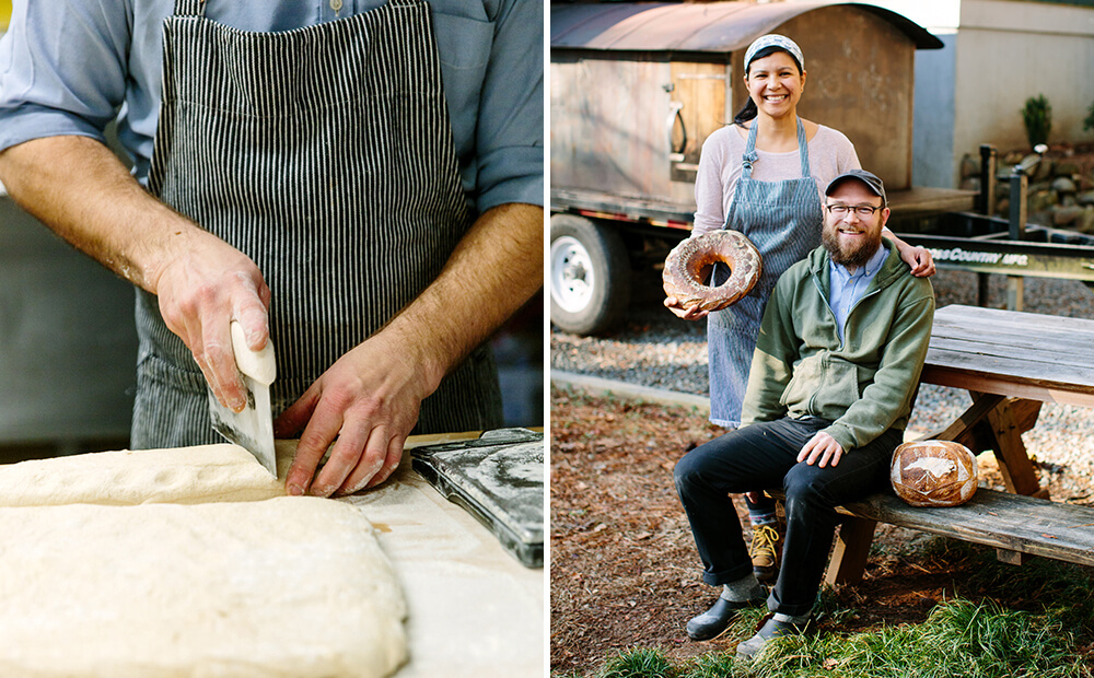Monica and Rob Segovia-Welsh, owners of Chicken Bridge Bakery, specialize in hearth-baked bread made from North Carolina flour. Their bread-making involves cutting and leavening the dough. photograph by Anagram Photo