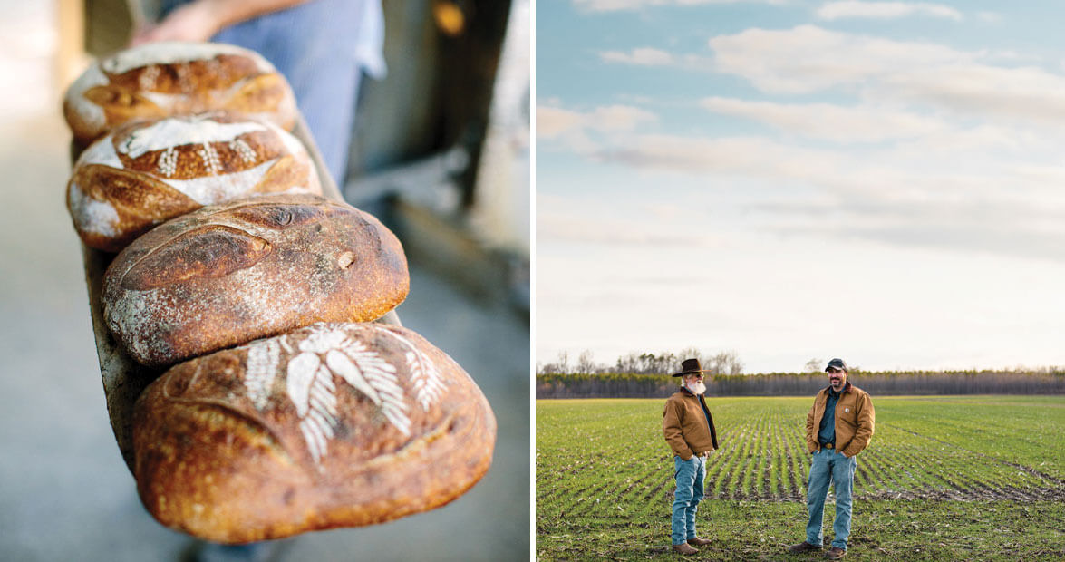 Local bread takes many hands to make and starts from the ground up, in fields like the ones tilled by father-and-son farmers Kenny and Ben Haines of Looking Back Farm in Tyner, a community in Perquimans County on the edge of Albemarle Sound. Here, the horizon runs in a straight line. The Haineses’ farm is around 300 acres, which is small compared to commercial grain operations. In 1987, the family switched to organic farming, a big step that, at the time, made them “the weird people down the road,” according to Kenny. “But now they think I’m only half nuts,” he adds with a wry smile.