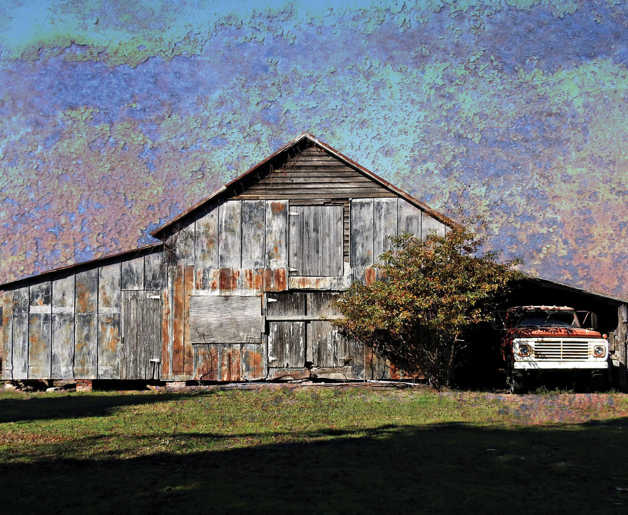 Brown’s altered photos are sometimes mistaken for paintings. “There are few great barns left around this part of the state,” he says of his favorite subjects. “There are no uses for them, so why spend money to replace roofs and boards?” But his vivid photos keep the memories alive. photograph by Watson Brown