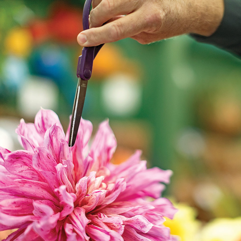 Jimmy Speas brings a tool kit to groom flower entries at the fair, including his enormous pink Maki dahlia. photograph by Charles Harris