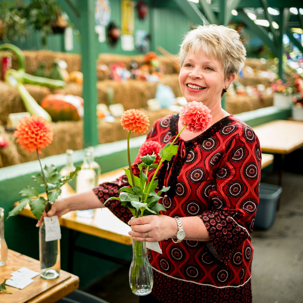 An hour later, judges wearing comfortable shoes, with clipboards and notebooks in hand, begin their rounds. “These people took time out of their day to come down here and bring fresh-cut flowers,” says dahlia judge Megan George, marveling at the array of entries. “And they nurtured them all summer long, just to get to this.” She and her judging partner, Sandra Zazzara, tilt the jar vases and hold them up to eye level, examining stamens and foliage. The rainbow of dahlias has become quite the attraction. Pink, red, orange sherbet, dark purple, but no blue ones. There’s no such thing. Yet.