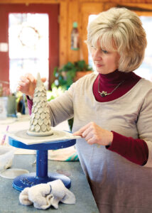 Bobbie Thomas is known for her clay pieces built by hand instead of turned on a potter’s wheel, such as Christmas trees, wall vases, and decorative serving pieces. photograph by Stacey Van Berkel