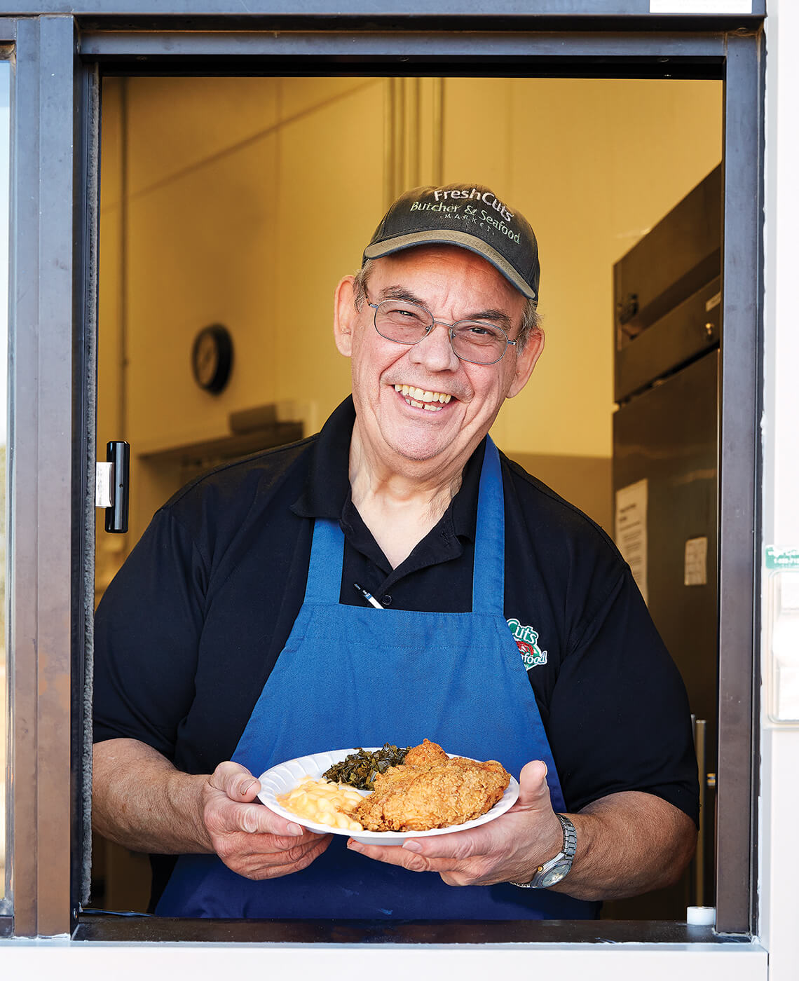 “The King” of Seagrove keeps his subjects sated with Fresh Cuts’ classic meat-and-three plates piled high with fried chicken, mac ’n’ cheese, hush puppies, and greens. photograph by Stacey Van Berkel