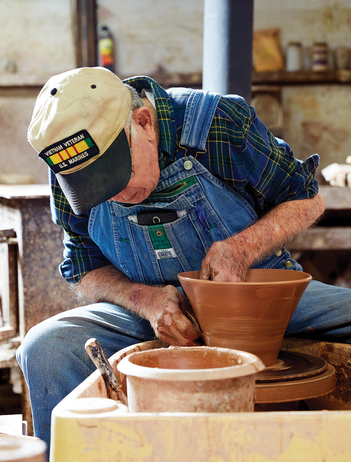Seagrove potters built this community of studios and shops from the ground up, literally. The area was naturally rich in red clay that punished farmers and rewarded potters, who turned it into simple, serviceable pieces like jugs and churns to use in their homes and sell for a little cash. As customers’ needs and tastes evolved, and with encouragement from affluent art collectors, the modern era of Seagrove pottery began in 1917. The “turners and burners” shifted to more artistic and profitable pieces that would garner worldwide acclaim. Collectors with knowing eyes can quickly spot Seagrove pieces, both vintage and contemporary, recognizing shapes and glazes found nowhere else. Seagrove is in the geographic center of the state, but for many people, it’s the center of the pottery universe.